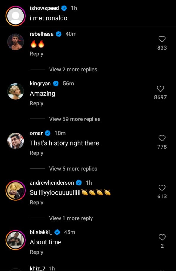 And all of this was documented on video. His entire YouTube discussion was spamming while Speed was having a party. Many others in chat couldn’t help but express their support for the streamer because of how long he has been trying to meet Ronaldo. Ryan García commented “Amazing”, Money Kicks and Others Reacted in his Instagram post saying – “That’s History Right There”